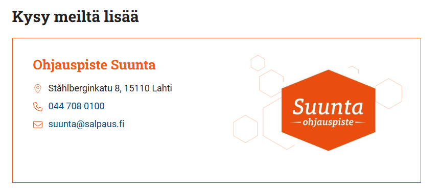 Olemme myös kaikkia teitä varten, jotka työssänne ohjaatte asiakkaitanne tai oppilaitanne ammatilliseen koulutukseen. Ota yhteyttä Ohjauspiste Suuntaan, kun sinulla tulee kysymyksiä Salpauksesta tai meille hakemisesta.